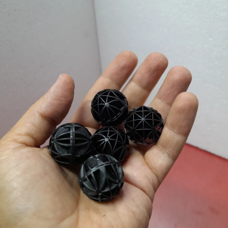 این محیط باید به اندازه ی کافی زبر باشد که باکتری ها بتوانند به آن بچسبند. بیو بال ها از جنس پلاستیک ABS می باشند و به دلیل داشتن شکل کروی وقتی در کنار هم قرار میگیرند بین آن ها فضای خالی ایجاد می شود که باعث می شود آب در میان این فرورفتگی ها و فضاهای خالی بیشتر جریان داشته باشد و جریال آب را نا منظم می کنند که همین امر کمک شایانی به هوا رسانی به باکتری ها می کند ، در نتیجه هر چه حجم فضاهای خالی میان بیو بال ها بیشتر باشد برای رشد باکتری ها مناسب تر است.