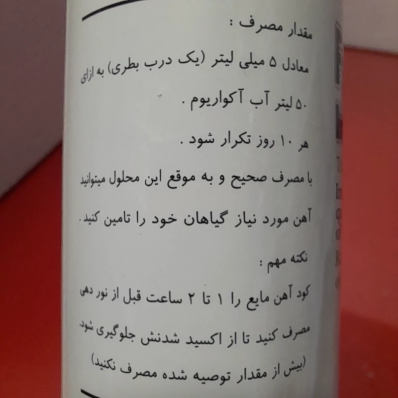محلول کود آهن آکواریوم آکوا گیاهان آکواریوم علاوه بر جذب مواد مغذی از طریق ریشه خود در بستر آکواریوم جهت حفظ سلامت و شادابی،رشد سریعتر و فتوسنتز بهتر نیازمند جذب مواد مغذی از طریق برگ های خود نیز میباشند. که این مهم با اضافه کردن کودهای مایع آکواریوم های میسر خواهد شد. که طبق دستورالعمل شرکت های سازنده مندرج بر روی بسته بندی محلول ها باید مصرف شود.